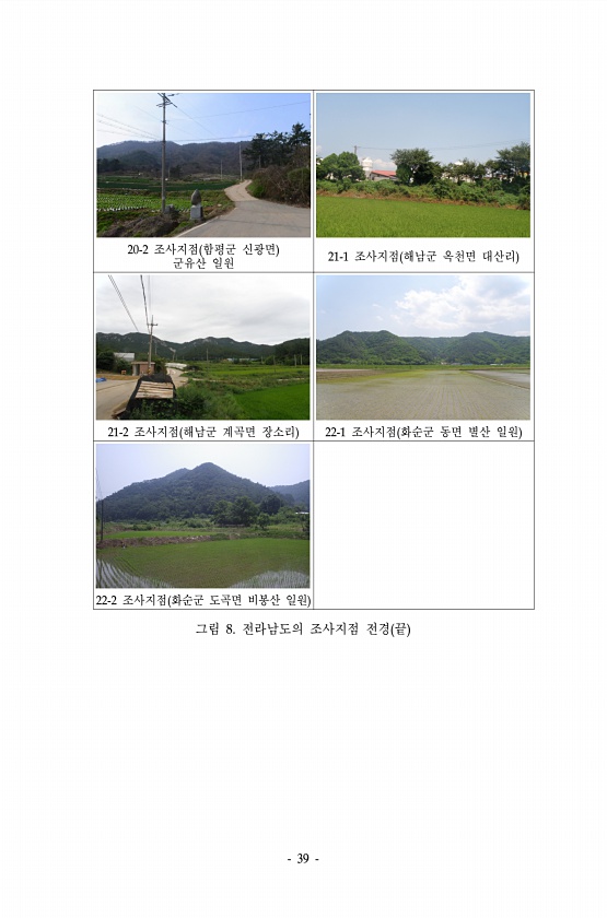 39 20-2 조사지점 함평군 신광면 군유산 일원 21-1 조사지점 해남군 옥천면 대산리 21-2 조사지점 해남군 계곡면 장소리 22-1 조사지점 화순군 동면 별산 일원 22-2 조사지점 화순군 도곡면 비봉산 일원 그림 8. 전라남도의 조사지점 전경 끝