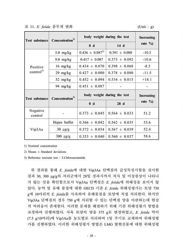 35 Test substance Concentration1 body weight during the test Increasing rate % 0 d 14 d Positive control3 5.0 mg/kg 0.436 ± 0.0872 0.391 ± 0.088 -10.3 9.0 mg/kg 0.417 ± 0.087 0.373 ± 0.092 -10.6 16 mg/kg 0.434 ± 0.070 0.398 ± 0.068 -8.3 29 mg/kg 0.427 ± 0.080 0.378 ± 0.080 -11.5 52 mg/kg 0.452 ± 0.094 0.534 ± 0.015 +18.1 94 mg/kg 0.451 ± 0.087 Test substance Concentration1 body weight during the t...