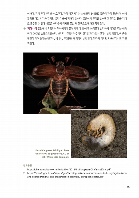 59 식하며, 특히 잔디 뿌리를 선호한다. 가장 심한 시기는 8-11월과 3-5월로 유충이 가장 활발하게 섭식 활동을 하는 시기와 건기인 봄과 가을에 피해가 심하다. 유충에게 뿌리를 섭식당한 잔디는 물을 제대 로 흡수할 수 없어 새로운 뿌리를 내리지도 못한 채 갈색으로 변하고 죽게 된다. ● 피해사례 유럽에서 유입되어 북아메리카 동부의 잔디, 원예 및 농작물에 심각하게 피해를 주는 해충 이다. 2001년 뉴웨스트민스터, 브리티시컬럼비아주에서 잔디밭과 가로수 길에서 발견되었다. 이 종은 천천히 퍼져 현재는 밴쿠버, 버너비, 코퀴틀람 전역에서 발견된다. 델타와 리치먼드 동부에서도 확인 되었다. 참고문헌 1. http//idl.entomology.cornell.edu/files/2013/11/European-Ch...