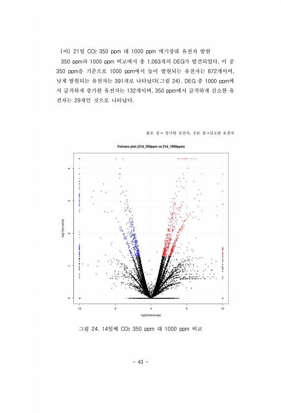 43 아 21일 CO2 350 ppm 대 1000 ppm 애기장대 유전자 발현 350 ppm과 1000 ppm 비교에서 총 1,063개의 DEG가 발견되었다. 이 중 350 ppm을 기준으로 1000 ppm에서 높이 발현되는 유전자는 672개이며, 낮게 발현되는 유전자는 391개로 나타났다 그림 24 DEG 중 1000 ppm에 서 급격하게 증가한 유전자는 132개이며, 350 ppm에서 급격하게 감소한 유 전자는 29개인 것으로 나타났다. 붉은 점⇒ 증가한 유전자, 푸른 점⇒감소한 유전자 그림 24. 14일째 CO2 350 ppm 대 1000 ppm비교