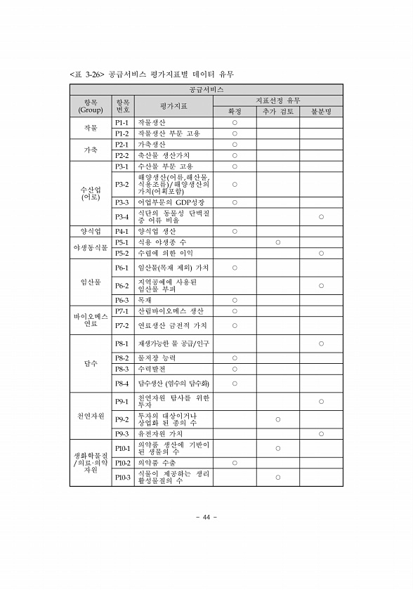 44 공급서비스 항목 Group 항목 번호 평가지표 확정 지표선정 추가 검토유무 불분명 작물 P1-1 작물생산 ○ P1-2 작물생산 부문 고용 ○ 가축 P2-1 가축생산 ○ P2-2 축산물 생산가치 ○ 수산업 어로 P3-1 수산물 부문 고용 ○ P3-2 해양생산 어류,해산물, 식용조류 /해양생산의 가치 어획포함 ○ P3-3 어업부문의 GDP성장 ○ P3-4 식단의 동물성 단백질 중 어류 비율 ○ 양식업 P4-1 양식업 생산 ○ 야생동식물 P5-1 식용 야생종 수 ○ P5-2 수렵에 의한 이익 ○ 임산물 P6-1 임산물 목재 제외 가치 ○ P6-2 지역공예에 사용된 임산물 부피 ○ P6-3 목재 ○ 바이오메스 연료 P7-1 산림바이오메스 생산 ○ P7-2 연료생산 금전적 가치 ○ 담수 P8-1 재생가능한 물 ...