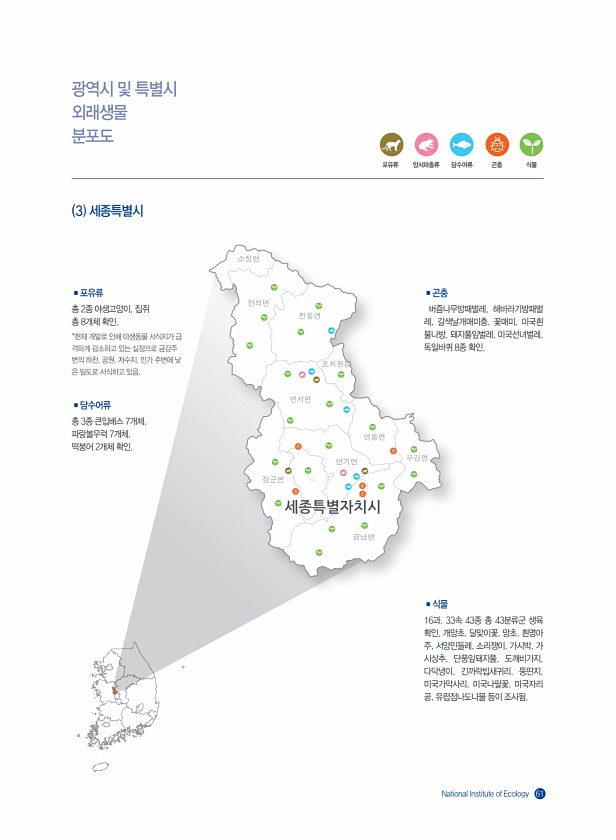 National Institute of Ecology 61 포유류 양서파충류 담수어류 곤충 식물 광역시 및 특별시 외래생물 분포도 3 세종특별시 ?포유류 총 2종 야생고양이, 집쥐 총 8개체 확인. *현재 개발로 인해 야생동물 서식지가 급 격하게 감소하고 있는 실정으로 금강주 변의 하천, 공원, 저수지, 민가 주변에 낮 은 밀도로 서식하고 있음. ?담수어류 총 3종 큰입배스 7개체, 파랑볼우럭 7개체, 떡붕어 2개체 확인. ?곤충 버즘나무방패벌레, 해바라기방패벌 레, 갈색날개매미충, 꽃매미, 미국흰 불나방, 돼지풀잎벌레, 미국선녀벌레, 독일바퀴 8종 확인. ?식물 16과, 33속 43종 총 43분류군 생육 확인. 개망초, 달맞이꽃, 망초, 흰명아 주, 서양민들레, 소리쟁이, 가시박, 가 시상추, 단풍잎돼지풀...