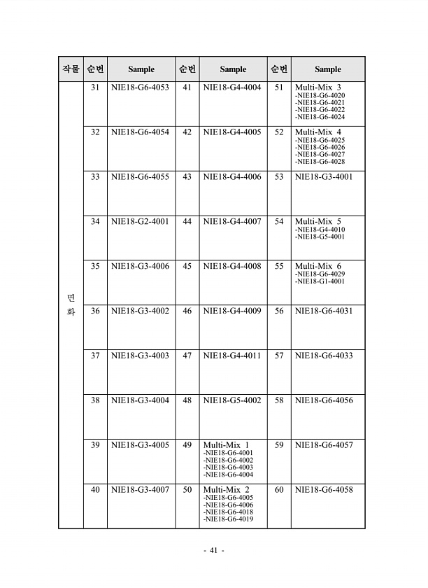 41 작물 순번 Sample 순번 Sample 순번 Sample 면 화 31 NIE18-G6-4053 41 NIE18-G4-4004 51 Multi-Mix 3 -NIE18-G6-4020 -NIE18-G6-4021 -NIE18-G6-4022 -NIE18-G6-4024 32 NIE18-G6-4054 42 NIE18-G4-4005 52 Multi-Mix 4 -NIE18-G6-4025 -NIE18-G6-4026 -NIE18-G6-4027 -NIE18-G6-4028 33 NIE18-G6-4055 43 NIE18-G4-4006 53 NIE18-G3-4001 34 NIE18-G2-4001 44 NIE18-G4-4007 54 Multi-Mix 5 -NIE18-G4-4010 -NIE18-G5-4001 35 NIE18-G3-...