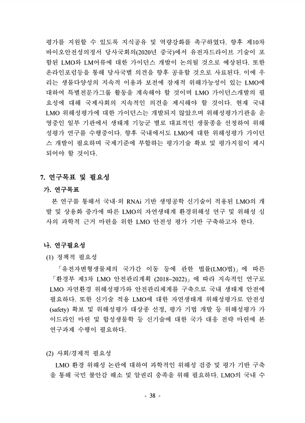 38 평가를 지원할 수 있도록 지식공유 및 역량강화를 촉구하였다. 향후 제10차 바이오안전성의정서 당사국회의 2020년 중국 에서 유전자드라이브 기술이 포 함된 LMO와 LM어류에 대한 가이던스 개발이 논의될 것으로 예상된다. 또한 온라인포럼등을 통해 당사국별 의견을 향후 공유할 것으로 사료된다. 이에 우 리는 생물다양성의 지속적 이용과 보전에 잠재적 위해가능성이 있는 LMO에 대하여 특별전문가그룹 활동을 계속해야 할 것이며 LMO 가이던스개발의 필 요성에 대해 국제사회의 지속적인 의견을 제시해야 할 것이다. 현재 국내 LMO 위해성평가에 대한 가이던스는 개발되지 않았으며 위해성평가기관을 운 영중인 일부 기관에서 생태계 기능군 별로 대표적인 생물종을 선정하여 위해 성평가 연구를 수행중이다. 향후 국내에서도 ...