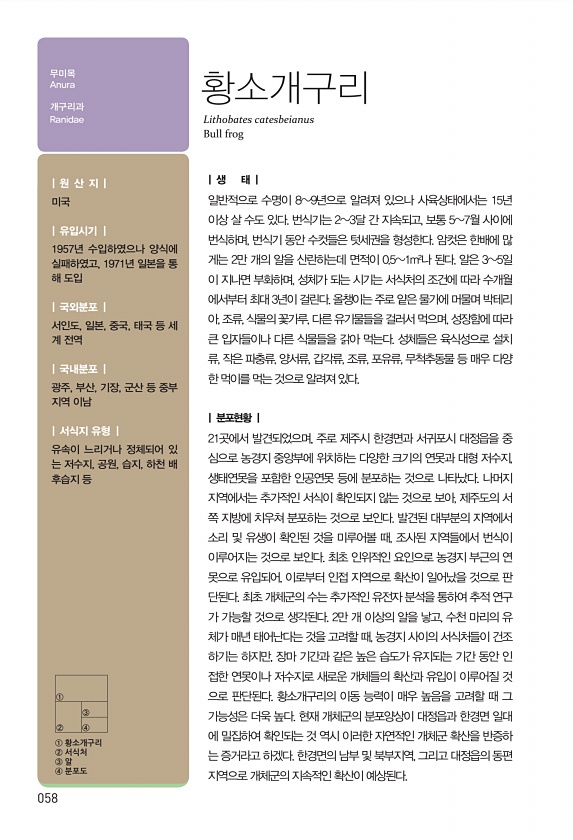058 ① ② ③ ④ ① 황소개구리 ② 서식처 ③ 알 ④ 분포도 | 생 태 | 일반적으로 수명이 89년으로 알려져 있으나 사육상태에서는 15년 이상 살 수도 있다. 번식기는 23달 간 지속되고, 보통 57월 사이에 번식하며, 번식기 동안 수컷들은 텃세권을 형성한다. 암컷은 한배에 많 게는 2만 개의 알을 산란하는데 면적이 0.51m²나 된다. 알은 35일 이 지나면 부화하며, 성체가 되는 시기는 서식처의 조건에 따라 수개월 에서부터 최대 3년이 걸린다. 올챙이는 주로 얕은 물가에 머물며 박테리 아, 조류, 식물의 꽃가루, 다른 유기물들을 걸러서 먹으며, 성장함에 따라 큰 입자들이나 다른 식물들을 갉아 먹는다. 성체들은 육식성으로 설치 류, 작은 파충류, 양서류, 갑각류, 조류, 포유류, 무척추동물 등 매우 ...