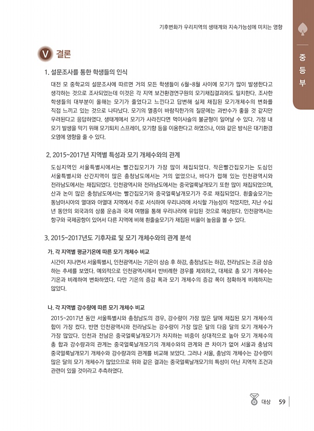 대상 59 중 등 부 기후변화가 우리지역의 생태계와 지속가능성에 미치는 영향 Ⅴ 결론 1. 설문조사를 통한 학생들의 인식 대전 모 중학교의 설문조사에 따르면 거의 모든 학생들이 6월8월 사이에 모기가 많이 발생한다고 생각하는 것으로 조사되었는데 이것은 각 지역 보건환경연구원의 모기채집결과와도 일치한다. 조사한 학생들의 대부분이 올해는 모기가 줄었다고 느낀다고 답변해 실제 채집된 모기개체수의 변화를 직접 느끼고 있는 것으로 나타났다. 모기의 멸종이 바람직한가의 질문에는 과반수가 좋을 것 같지만 우려된다고 응답하였다. 생태계에서 모기가 사라진다면 먹이사슬의 불균형이 일어날 수 있다. 가정 내 모기 발생을 막기 위해 모기퇴치 스프레이, 모기향 등을 이용한다고 하였으나, 이와 같은 방식은 대기환경 오염에 영향을 줄...