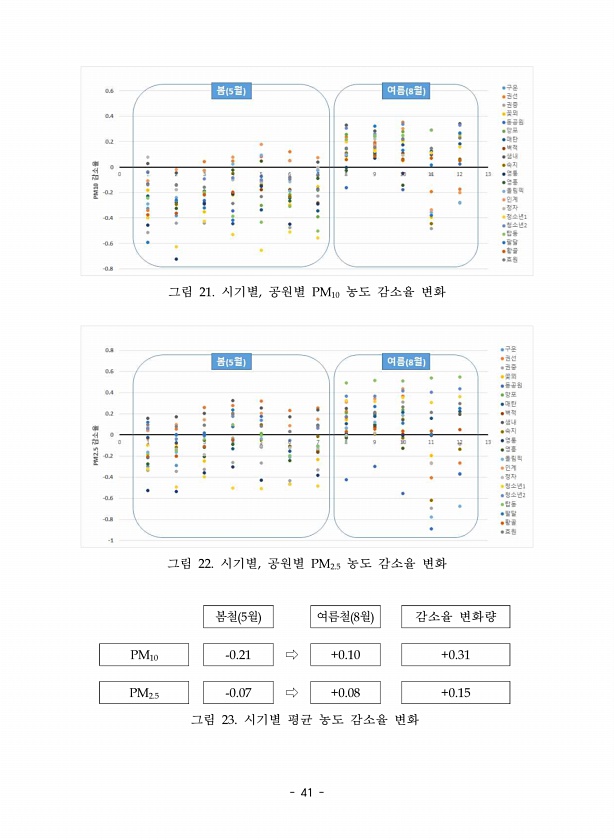 41 그림 21. 시기별, 공원별 PM10 농도 감소율 변화 그림 22. 시기별, 공원별 PM2.5 농도 감소율 변화 봄철 5월 여름철 P월 감소율 변화량 PM10 -0.21 ? +0.10 +0.L1 PM2.5 -0.0N ? +0.0P +0.15 그림 2L. 시기별 평균 농도 감소율변화