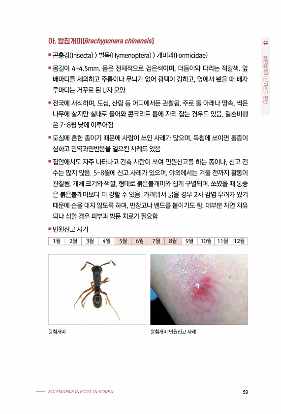 SOLENOPSIS INVICTA IN KOREA 59 3 붉은불개미 신고센터 운영 아. 왕침개미 Brachyponera chinensis ■ 곤충강 Insecta 벌목 Hymenoptera 개미과 Formicidae ■ 몸길이 44.5mm. 몸은 전체적으로 검은색이며, 더듬이와 다리는 적갈색. 앞 배마디를 제외하고 주름이나 무늬가 없어 광택이 강하고, 옆에서 봤을 때 배자 루마디는 거꾸로 된 U자 모양 ■ 전국에 서식하며, 도심, 산림 등 어디에서든 관찰됨. 주로 돌 아래나 땅속, 썩은 나무에 살지만 실내로 들어와 콘크리트 틈에 자리 잡는 경우도 있음. 결혼비행 은 78월 낮에 이루어짐 ■ 도심에 흔한 종이기 때문에 사람이 쏘인 사례가 많으며, 독침에 쏘이면 통증이 심하고 면역과민반응을 일으킨 사례도 있음...