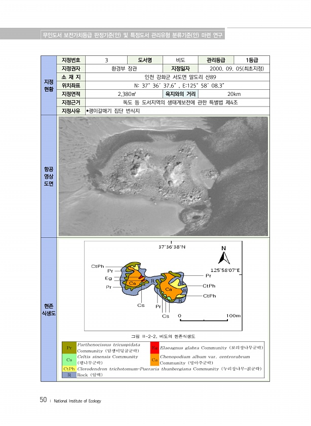 무인도서 보전가치등급 판정기준 안 및 특정도서 관리유형 분류기준 안 마련 연구 50 ? National Institute of Ecology 지정 현황 지정번호 3 도서명 비도 관리등급 1등급 지정권자 환경부 장관 지정일자 2000. 09. 05 최초지정 소 재 지 인천 강화군 서도면 말도리 산89 위치좌표 N37°36′37.6″, E125°58′08.3″ 지정면적 2,380㎡ 육지와의 거리 20km 지정근거 독도 등 도서지역의 생태계보전에 관한 특별법 제4조 지정사유 ?괭이갈매기 집단 번식지 항공 영상 도면 현존식생도