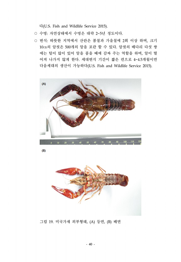 40 다 U.S. Fish and Wildlife Service 2015 ○ 수명자연상태에서 수명은 대략 25년 정도이다. ○ 번식따뜻한 지역에서 산란은 봄철과 가을철에 2회 이상 하며, 크기 10㎝의 암컷은 500개의 알을 포란 할 수 있다. 암컷의 배다리 다섯 쌍 에는 털이 많이 있어 알을 품을 때에 감싸 주는 역할을 하며, 알이 떨 어져 나가지 않게 한다. 세대번식 기간이 짧은 편으로 44.5개월이면 다음세대의 생산이 가능하다 U.S. Fish and Wildlife Service 2015 그림 19. 미국가재 외부형태, A 등면, B배면