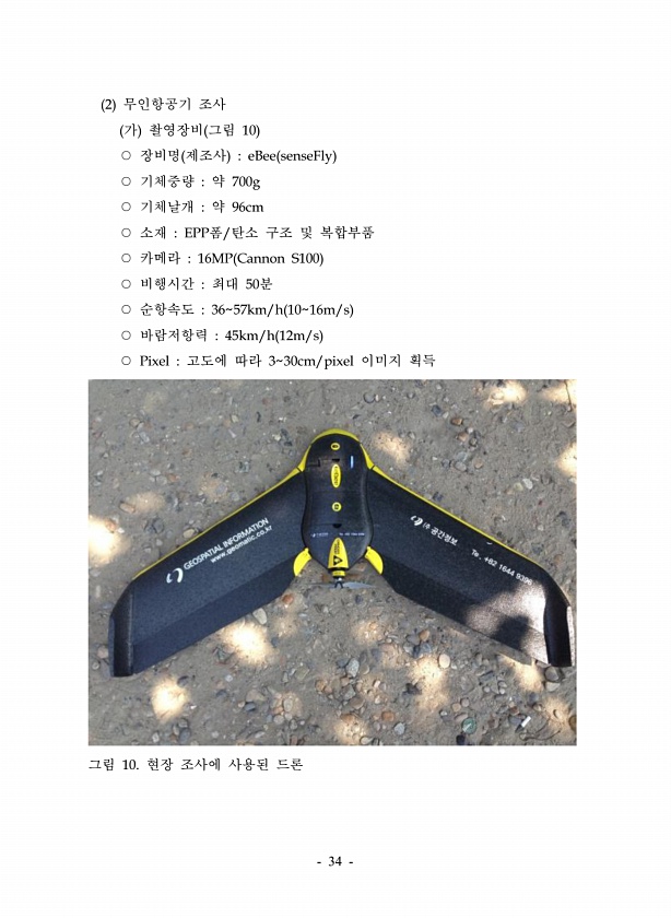 34 2 무인항공기 조사 가 촬영장비 그림 10 ○ 장비명 제조사 eBee senseFly ○ 기체중량 약 700g ○ 기체날개 약 96cm ○ 소재 EPP폼/탄소 구조 및 복합부품 ○ 카메라 16MP Cannon S100 ○ 비행시간 최대 50분 ○ 순항속도 3657km/h 1016m/s ○ 바람저항력 45km/h 12m/s ○ Pixel 고도에 따라 330cm/pixel 이미지 획득 그림 10. 현장 조사에 사용된드론
