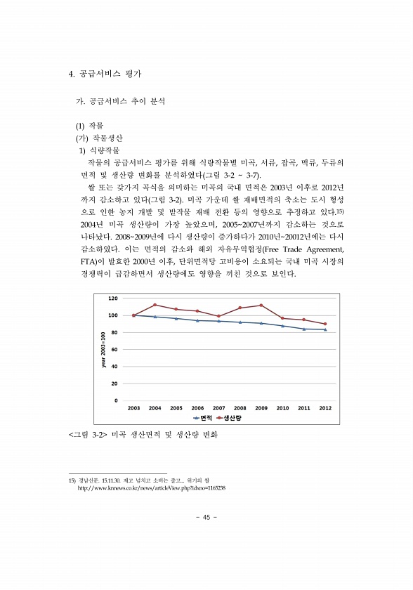 45 4. 공급서비스 평가 가. 공급서비스 추이 분석 1 작물 가 작물생산 1 식량작물 작물의 공급서비스 평가를 위해 식량작물별 미곡, 서류, 잡곡, 맥류, 두류의 면적 및 생산량 변화를 분석하였다 그림 3-2 3-7 쌀 또는 갖가지 곡식을 의미하는 미곡의 국내 면적은 2003년 이후로 2012년 까지 감소하고 있다 그림 3-2 미곡 가운데 쌀 재배면적의 축소는 도시 형성 으로 인한 농지 개발 및 밭작물 재배 전환 등의 영향으로 추정하고 있다.15 2004년 미곡 생산량이 가장 높았으며, 20052007년까지 감소하는 것으로 나타났다. 20082009년에 다시 생산량이 증가하다가 2010년20012년에는 다시 감소하였다. 이는 면적의 감소와 해외 자유무역협정 Free Trade Agreement, FTA 이...