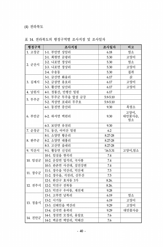 40 4 전라북도 표 14. 전라북도의 행정구역별 조사지점 및 조사일자 행정구역 조사지점 조사일자 비고 1. 고창군 1-1. 부안면 상암리 6.18 염소 2. 군산시 2-1. 회현면 금광리 5.30 고양이 2-2. 나포면 장상리 5.30 염소 2-3. 나포면 장상리 5.30 고양이 2-4. 수송동 5.30 집쥐 3. 김제시 3-1. 금산면 화율리 6.17 삵 3-2. 금삼면 용호리 6.17 고양이 3-3. 황산면 남산리 6.17 고양이 4. 남원시 4-1. 청룡산, 만행산 일원 6.17 5. 무주군 5-1. 무주군 무주읍 앞섬 금강 5.9-5.10 5-2. 적상면 포내리 무주호 5.9-5.10 6. 부안군 6-1. 동진면 증산리 9.30 흑염소 6-2. 하서면 백련리 9.30 고양이, 대만꽃사슴, 염소 6-...