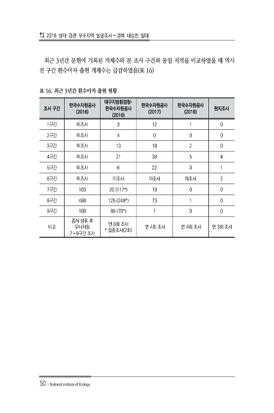 2018 생태·경관 우수지역 발굴조사 경북 내성천 일대 50 ? National Institute of Ecology 최근 3년간 문헌에 기록된 개체수와 본 조사 구간과 동일 지역을 비교하였을 때 역시 전 구간 흰수마자 출현 개체수는 급감하였음 표 16 조사 구간 한국수자원공사 2016 대구지방환경청· 한국수자원공사 2016 한국수자원공사 2017 한국수자원공사 2018 현지조사 1구간 미조사 3 12 1 0 2구간 미조사 4 0 0 0 3구간 미조사 13 18 2 0 4구간 미조사 21 39 5 4 5구간 미조사 6 22 0 1 6구간 미조사 미조사 미조사 미조사 2 7구간 103 20 117* 19 0 0 8구간 468 125 248* 73 1 0 9구간 100 86 70* 1 0 0 비고 증식 방류 후...