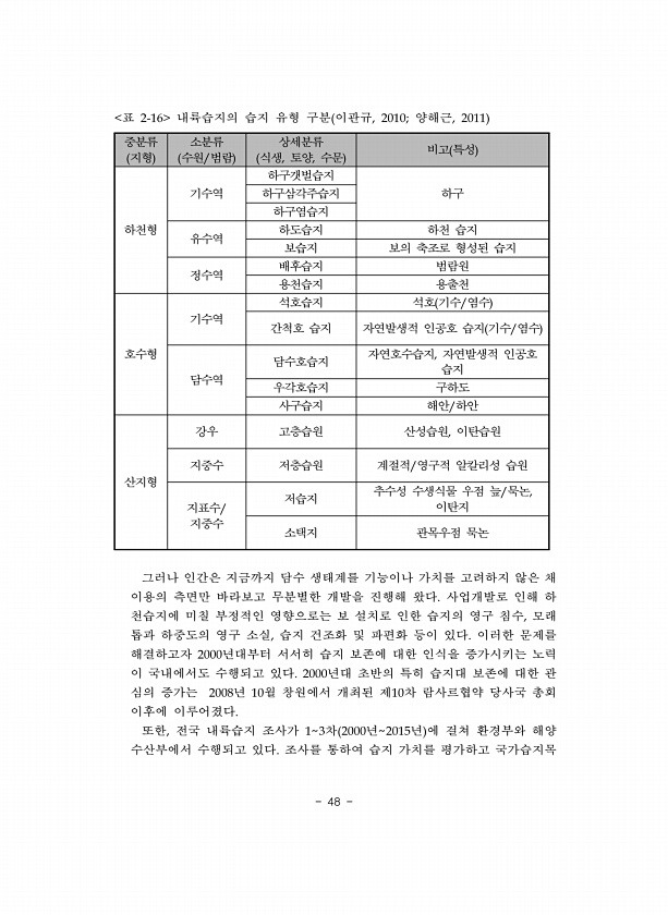 48 중분류 지형 소분류 수원 범람 상세분류 식생 토양 수문 비고 특성 하천형 기수역 하구갯벌습지 하구삼각주습지 하구 하구염습지 유수역 하도습지 하천 습지 보습지 보의 축조로 형성된 습지 정수역 배후습지 범람원 용천습지 용출천 호수형 기수역 석호습지 석호 기수 염수 간척호 습지 자연발생적 인공호 습지 기수 염수 담수역 담수호습지 자연호수습지 자연발생적 인공호 습지 우각호습지 구하도 사구습지 해안 하안 산지형 강우 고층습원 산성습원 이탄습원 지중수 저층습원 계절적 영구적 알칼리성 습원 지표수 지중수 저습지 추수성 수생식물 우점 늪 묵논 이탄지 소택지 관목우점 묵논 표 내륙습지의 습지 유형 구분 이관규 양해근 그러나 인간은 지금까지 담수 생태계를 기능이나 가치를 고려하지 않은 채 이용의 측면만 바라보고 무분별한...