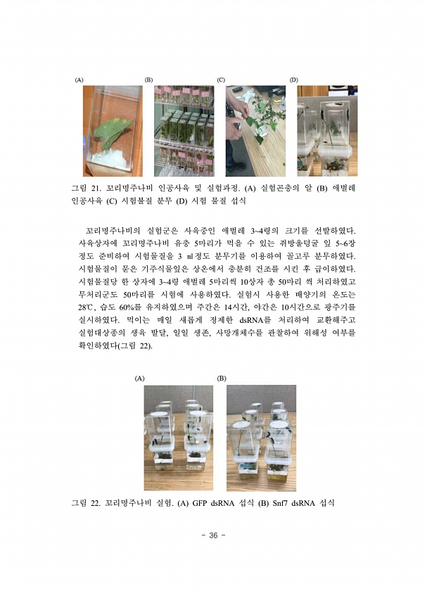 36 그림 21. 꼬리명주나비 인공사육 및 실험과정. A 실험곤충의 알 B 애벌레 인공사육 C 시험불질 분무 D 시험 물질 섭식 꼬리명주나비의 실험군은 사육중인 애벌레 34령의 크기를 선발하였다. 사육상자에 꼬리명주나비 유충 5마리가 먹을 수 있는 쥐방울덩굴 잎 56장 정도 준비하여 시험물질을 3 ㎖정도 분무기를 이용하여 골고루 분무하였다. 시험물질이 묻은 기주식물잎은 상온에서 충분히 건조를 시킨 후 급이하였다. 시험물질당 한 상자에 34령 애벌레 5마리씩 10상자 총 50마리 씩 처리하였고 무처리군도 50마리를 시험에 사용하였다. 실험시 사용한 배양기의 온도는 28℃ , 습도 60%를 유지하였으며 주간은 14시간, 야간은 10시간으로 광주기를 실시하였다. 먹이는 매일 새롭게 정제한 dsRNA를 처리하여 교...