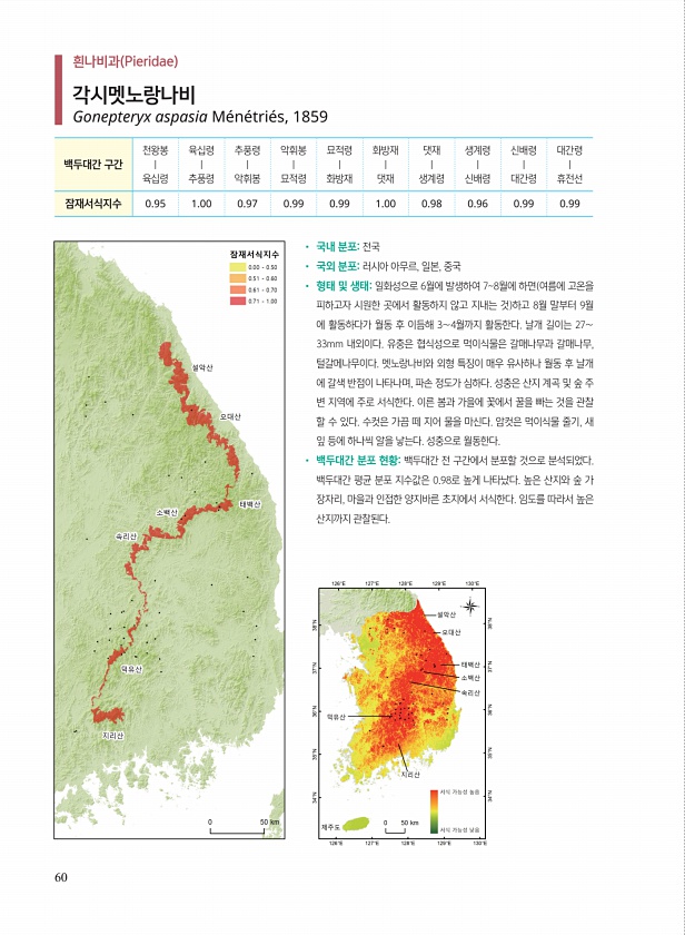 60 ? 국내 분포전국 ? 국외 분포러시아 아무르, 일본, 중국 ? 형태 및 생태일화성으로 6월에 발생하여 78월에 하면 여름에 고온을 피하고자 시원한 곳에서 활동하지 않고 지내는 것 하고 8월 말부터 9월 에 활동하다가 월동 후 이듬해 3∼4월까지 활동한다. 날개 길이는 27∼ 33mm 내외이다. 유충은 협식성으로 먹이식물은 갈매나무과 갈매나무, 털갈메나무이다. 멧노랑나비와 외형 특징이 매우 유사하나 월동 후 날개 에 갈색 반점이 나타나며, 파손 정도가 심하다. 성충은 산지 계곡 및 숲 주 변 지역에 주로 서식한다. 이른 봄과 가을에 꽃에서 꿀을 빠는 것을 관찰 할 수 있다. 수컷은 가끔 떼 지어 물을 마신다. 암컷은 먹이식물 줄기, 새 잎 등에 하나씩 알을 낳는다. 성충으로 월동한다. ? 백두대간 분포 ...