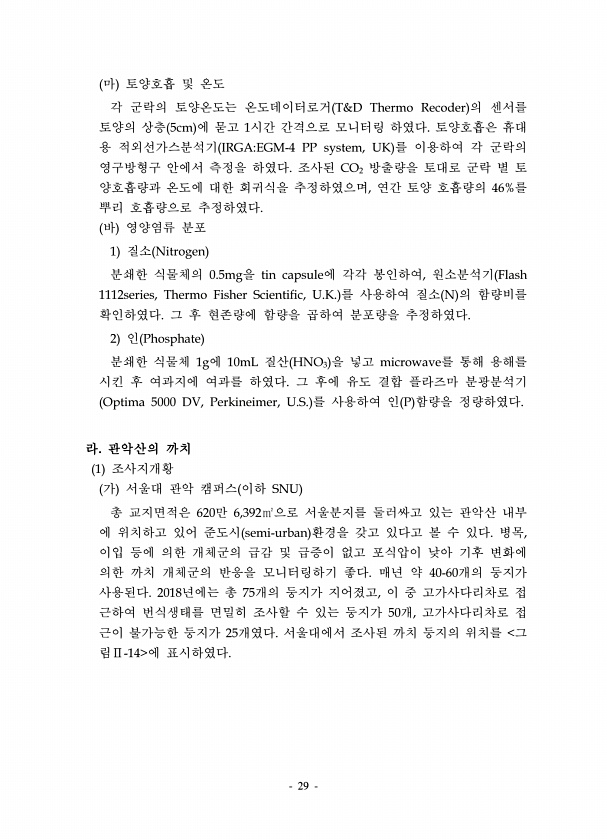 29 마 토양호흡 및 온도 각 군락의 토양온도는 온도데이터로거 T&D Thermo Recoder 의 센서를 토양의 상층 5cm 에 묻고 1시간 간격으로 모니터링 하였다. 토양호흡은 휴대 용 적외선가스분석기 IRGAEGM-4 PP system, UK 를 이용하여 각 군락의 영구방형구 안에서 측정을 하였다. 조사된 CO2 방출량을 토대로 군락 별 토 양호흡량과 온도에 대한 회귀식을 추정하였으며, 연간 토양 호흡량의 46%를 뿌리 호흡량으로 추정하였다. 바 영양염류 분포 1 질소 Nitrogen 분쇄한 식물체의 0.5mg을 tin capsule에 각각 봉인하여, 원소분석기 Flash 1112series, Thermo Fisher Scientific, U.K. 를 사용하여 질소 N 의 함량비를 확인하였다. 그 후 ...