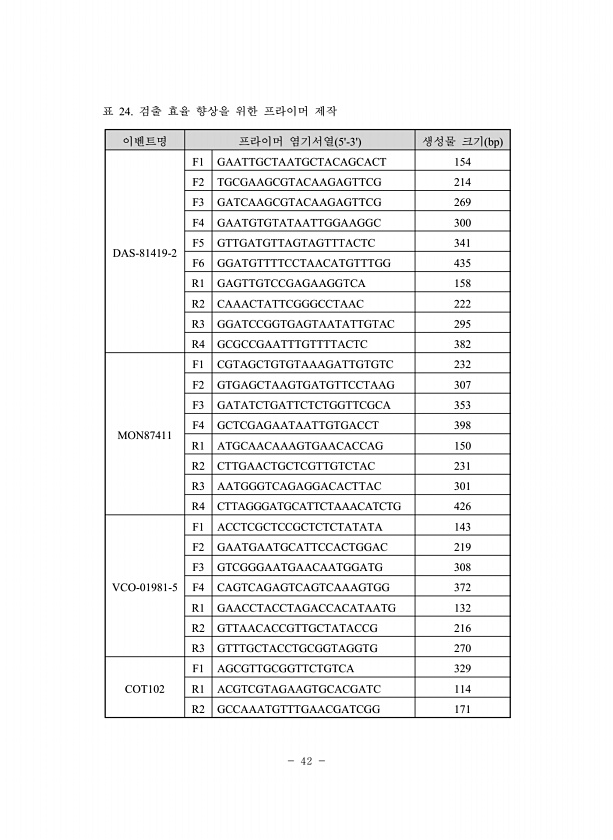 42 표 24. 검출 효율 향상을 위한 프라이머 제작 이벤트명 프라이머 염기서열 5-3생성물 크기 bp DAS-81419-2 F1 GAATTGCTAATGCTACAGCACT 154 F2 TGCGAAGCGTACAAGAGTTCG 214 F3 GATCAAGCGTACAAGAGTTCG 269 F4 GAATGTGTATAATTGGAAGGC 300 F5 GTTGATGTTAGTAGTTTACTC 341 F6 GGATGTTTTCCTAACATGTTTGG 435 R1 GAGTTGTCCGAGAAGGTCA 158 R2 CAAACTATTCGGGCCTAAC 222 R3 GGATCCGGTGAGTAATATTGTAC 295 R4 GCGCCGAATTTGTTTTACTC 382 MON87411 F1 CGTAGCTGTGTAAAGATTGTGTC 232 ...