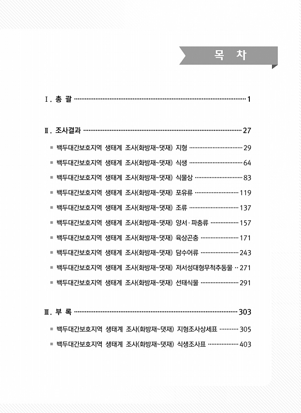 목 차 Ⅰ. 총 괄 ·································································································1 Ⅱ. 조사결과 ··························································································27 ? 백두대간보호지역 생태계 조사 화방재댓재 지형 ································29 ? 백두대간보호지역 생태계 조사 화방재댓재 식생 ································64 ? 백두대간보호지역 생태계 조사 화방재댓재 식물상 ·····························83 ? 백두대...