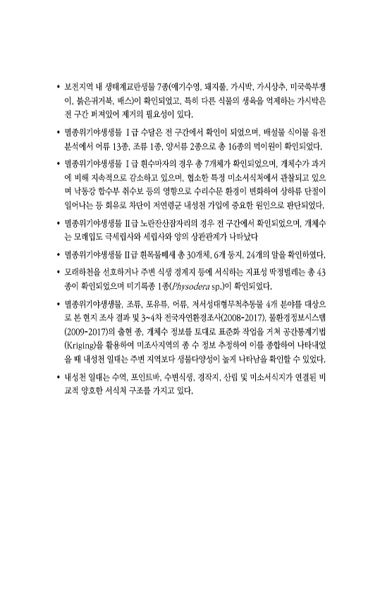 ? 보전지역 내 생태계교란생물 7종 애기수영, 돼지풀, 가시박, 가시상추, 미국쑥부쟁 이, 붉은귀거북, 배스 이 확인되었고, 특히 다른 식물의 생육을 억제하는 가시박은 전 구간 퍼져있어 제거의 필요성이 있다. ? 멸종위기야생생물 Ⅰ급 수달은 전 구간에서 확인이 되었으며, 배설물 식이물 유전 분석에서 어류 13종, 조류 1종, 양서류 2종으로 총 16종의 먹이원이 확인되었다. ? 멸종위기야생생물 Ⅰ급 흰수마자의 경우 총 7개체가 확인되었으며, 개체수가 과거 에 비해 지속적으로 감소하고 있으며, 협소한 특정 미소서식처에서 관찰되고 있으 며 낙동강 합수부 취수보 등의 영향으로 수리수문 환경이 변화하여 상하류 단절이 일어나는 등 회유로 차단이 저연령군 내성천 가입에 중요한 원인으로 판단되었다. ? 멸종위기야생생물 ...