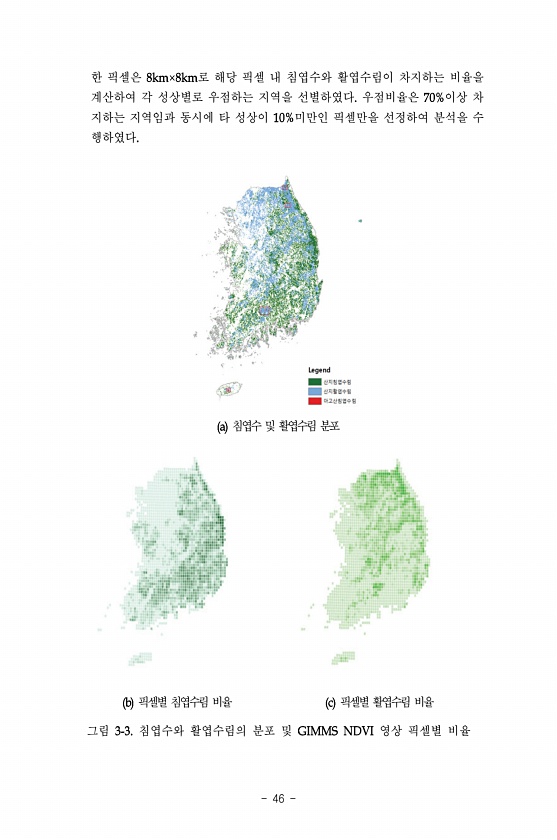 46 한 픽셀은 로 해당 픽셀 내 침엽수와 활엽수림이 차지하는 비율을 계산하여 각 성상별로 우점하는 지역을 선별하였다 우점비율은 이상 차 지하는 지역임과 동시에 타 성상이 미만인 픽셀만을 선정하여 분석을 수 행하였다 침엽수 및 활엽수림 분포 픽셀별 침엽수림 비율 픽셀별 활엽수림 비율 그림 침엽수와 활엽수림의 분포 및 영상 픽셀별비율