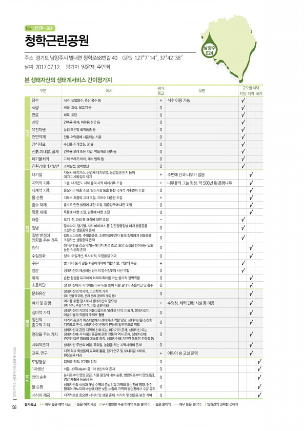 No. 남양주 남양주 024 본 생태자산의 생태계서비스 간이평가지 구분 예시 평가 등급 설명 규모별 혜택 지점 지역 국가 공급 담수 식수, 농업용수, 축산 용수 등 + 식수 이용 가능 √ 식량 곡물, 과실, 물고기 등 0 √ 연료 화목, 토탄 0 √ 섬유 건축용 목재, 의류용 섬유 등 0 √ 유전자원 농업·축산업 희귀품종 등 0 √ 천연약재 전통 의약품에 사용되는 식물 0 √ 장식재료 수집용 조개껍질, 꽃 등 0 √ 진흙,미네랄, 골재 건축용 모래 또는 자갈, 벽돌재료 진흙 등 0 √ 폐기물처리 고체 쓰레기 하치, 폐수 방류 등 0 √ 친환경에너지발전 조력발전, 풍력발전 0 √ 조절 대기질 자동차 배기가스, 산업체 대기오염, 농업발생 먼지 등의 대기 미세물질의 제거 + 주변에 산과 나무가 많음 √ 지역적 기...