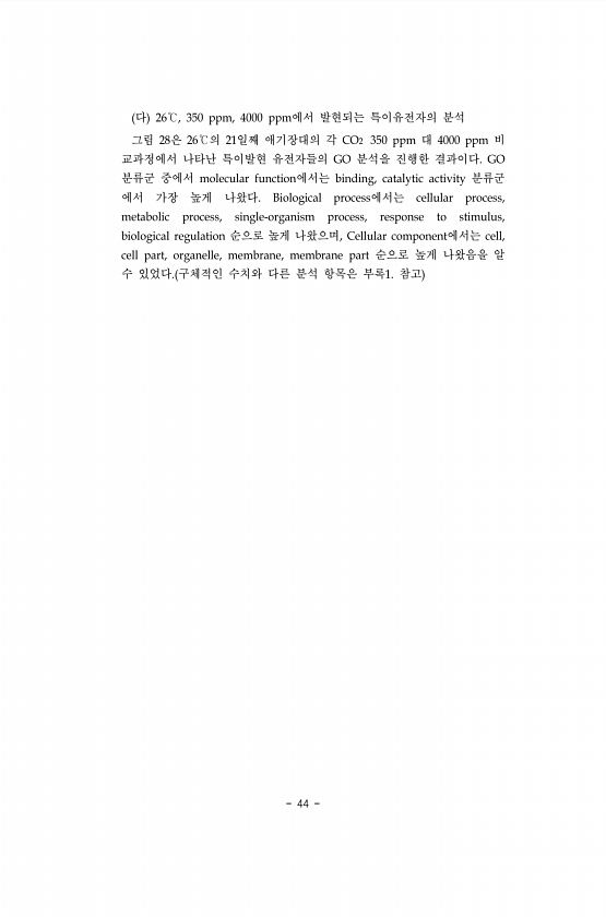 44 다 26℃, 350 ppm, 4000 ppm에서 발현되는 특이유전자의 분석 그림 28은 26℃의 21일째 애기장대의 각 CO2 350 ppm 대 4000 ppm 비 교과정에서 나타난 특이발현 유전자들의 GO 분석을 진행한 결과이다. GO 분류군 중에서 molecular function에서는 binding, catalytic activity 분류군 에서 가장 높게 나왔다. Biological process에서는 cellular process, metabolic process, single-organism process, response to stimulus, biological regulation 순으로 높게 나왔으며, Cellular component에서는 cell, cell part, organell...