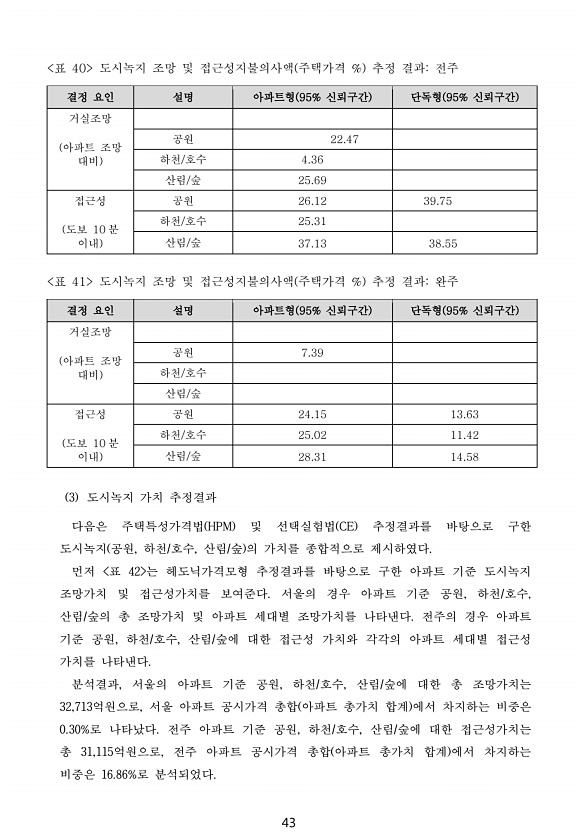 43 표 40 도시녹지 조망 및 접근성지불의사액 주택가격 % 추정 결과전주 결정 요인 설명 아파트형 95% 신뢰구간 단독형 95% 신뢰구간 거실조망 아파트 조망 대비 공원 22.47 하천/호수 4.36 산림/숲 25.69 접근성 도보 10 분 이내 공원 26.12 39.75 하천/호수 25.31 산림/숲 37.13 38.55 표 41 도시녹지 조망 및 접근성지불의사액 주택가격 % 추정 결과완주 결정 요인 설명 아파트형 95% 신뢰구간 단독형 95% 신뢰구간 거실조망 아파트 조망 대비 공원 7.39 하천/호수 산림/숲 접근성 도보 10 분 이내 공원 24.15 13.63 하천/호수 25.02 11.42 산림/숲 28.31 14.58 3 도시녹지 가치 추정결과 다음은 주택특성가격법 HPM 및 선택실험법 CE 추...