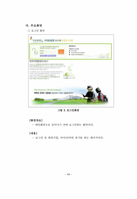 44 다. 주요화면 ○ 로그인 화면 그림 5. 로그인화면 [화면개요] 메인화면으로 들어가기 전에 로그인하는 화면이다. [내용] 로그인 및 회원가입, 아이디/비번 찾기를 하는페이지이다.