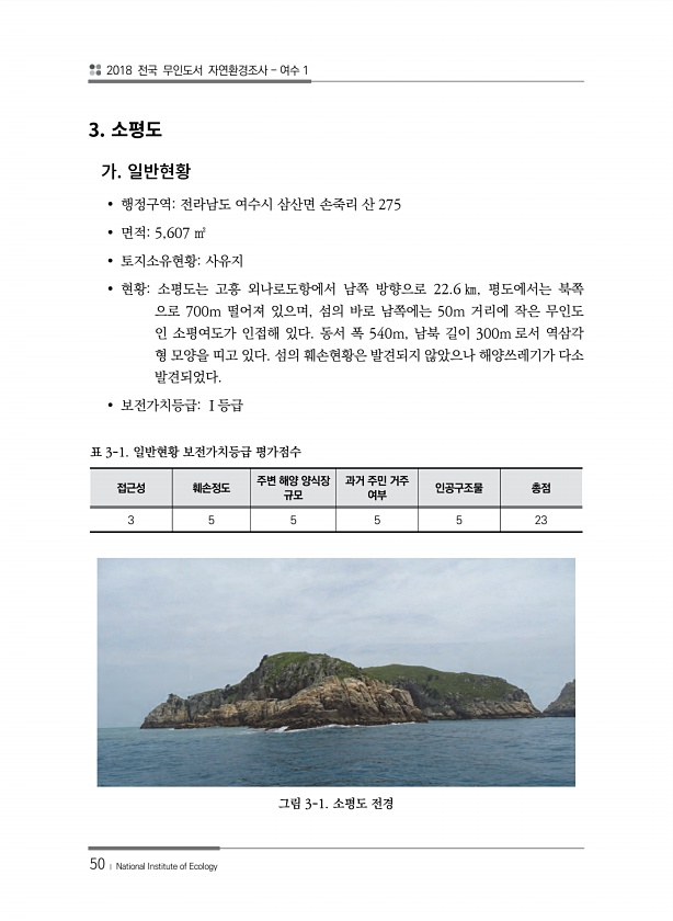 2018 전국 무인도서 자연환경조사 여수 1 50 ? National Institute of Ecology 3. ? 행정구역전라남도 여수시 삼산면 손죽리 산 275 ? 면적5,607 ㎡ ? 토지소유현황사유지 ? 현황소평도는 고흥 외나로도항에서 남쪽 방향으로 22.6 ㎞, 평도에서는 북쪽 으로 700m 떨어져 있으며, 섬의 바로 남쪽에는 50m 거리에 작은 무인도 인 소평여도가 인접해 있다. 동서 폭 540m, 남북 길이 300m 로서 역삼각 형 모양을 띠고 있다. 섬의 훼손현황은 발견되지 않았으나 해양쓰레기가 다소 발견되었다. ? 보전가치등급Ⅰ등급 접근성 훼손정도 주변 해양 양식장 규모 과거 주민 거주 여부 인공구조물 총점 3 5 5 5 5 23 표 3-1. 일반현황 보전가치등급 평가점수 그림 3-1. 소평...