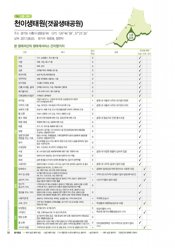 군산 001 No. 시흥 시흥 024 본 생태자산의 생태계서비스 간이평가지 구분 예시 평가 등급 설명 규모별 혜택 지점 지역 국가 공급 담수 식수, 농업용수, 축산 용수 등 0 √ 식량 곡물, 과실, 물고기 등 0 √ 연료 화목, 토탄 0 √ 섬유 건축용 목재, 의류용 섬유 등 0 √ 유전자원 농업·축산업 희귀품종 등 0 √ 천연약재 전통 의약품에 사용되는 식물 0 √ 장식재료 수집용 조개껍질, 꽃 등 0 √ 진흙,미네랄, 골재 건축용 모래 또는 자갈, 벽돌재료 진흙 등 0 √ 폐기물처리 고체 쓰레기 하치, 폐수 방류 등 0 √ 친환경에너지발전 조력발전, 풍력발전 0 √ 조절 대기질 자동차 배기가스, 산업체 대기오염, 농업발생 먼지 등의 대기 미세물질의 제거 + 공원 내 식물과 나무로 대기공기정화 √ 지역적...