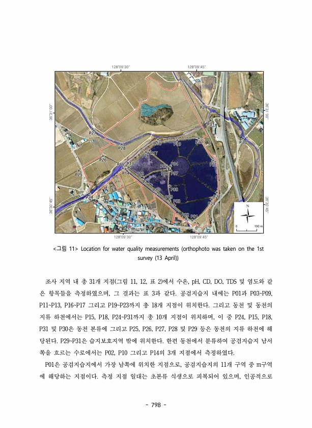 798 그림 11 Location for water quality measurements orthophoto was taken on the 1st survey 13 April 조사 지역 내 총 31개 지점 그림 11, 12, 표 2 에서 수온, pH, CD, DO, TDS 및 염도와 같 은 항목들을 측정하였으며, 그 결과는 표 3과 같다. 공검지습지 내에는 P01과 P03P09, P11P13, P16P17 그리고 P19P23까지 총 18개 지점이 위치한다. 그리고 동천 및 동천의 지류 하천에서는 P15, P18, P24P31까지 총 10개 지점이 위치하며, 이 중 P24, P15, P18, P31 및 P30은 동천 본류에 그리고 P25, P26, P27, P28 및 P29 등은 동천의 지류 하천에 해 당된다...