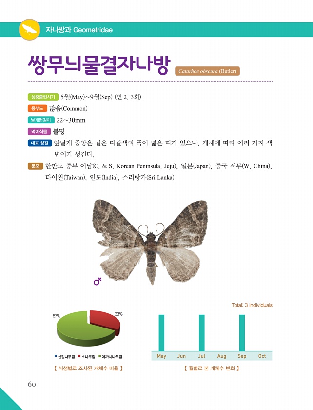 60 자나방과 Geometridae 성충출현시기 5월 May 9월 Sep 연 2, 3회 풍부도 많음 Common 날개편길이 2230mm 먹이식물 불명 대표 형질 앞날개 중앙은 짙은 다갈색의 폭이 넓은 띠가 있으나, 개체에 따라 여러 가지 색 변이가 생긴다. 분포 한반도 중부 이남 C. & S. Korean Peninsula, Jeju , 일본 Japan , 중국 서부 W. China , 타이완 Taiwan , 인도 India , 스리랑카 Sri Lanka 쌍무늬물결자나방 Catarhoe obscura Butler 【 월별로 본 개체수 변화 】 Total3 individuals 【 식생별로 조사된 개체수 비율 】 67% 신갈나무림 소나무림 아까시나무림 33% May Jun Jul Aug SepOct