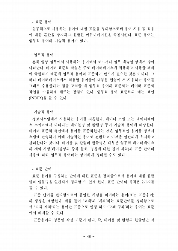 표준 용어 업무적으로 사용하는 용어에 대한 표준을 정의함으로써 용어 사용 및 적용 에 대한 혼란을 방지하고 원활한 커뮤니케이션을 촉진시킨다. 표준 용어는 업무적 용어와 기술적 용어가 있다. ·업무적 용어 흔히 일상 업무에서 사용하는 용어로서 보고서나 업무 매뉴얼 상에서 많이 나타난다. 데이터 표준화 작업은 주로 데이터베이스에 적용하고 사용할 객체 에 국한되기 때문에 업무적 용어의 표준화가 반드시 필요한 것은 아니다. 그 러나 데이터베이스에서 적용할 용어들이 대부분 현업에 서 사용하는 용어를 그대로 수용한다는 점을 고려할 때 업무적 용어의 표준화는 데이터 표준화 작업을 수월하게 해주는 장점이 있다. 업무적 용어 표준화의 예는 색인 INDEX 을 들 수 있다. ·기술적 용어 정보시스템에서 사용하는 용어를 지칭한...