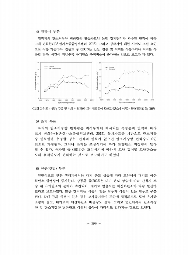 390 4 경작지 부문 경작지의 탄소저장량 변화량은 활동자료인 논밭 경지면적과 과수원 면적에 따라 크게 변화한다 온실가스종합정보센터, 2015 그리고 경작지에 대한 시비도 조절 요인 으로 작용 가능하다. 정원교 등 2007 은 인산, 칼륨 및 석회를 사용하거나 퇴비를 사 용할 경우, 시간이 지날수록 유기탄소 축적비율이 증가하는 것으로 보고한 바 있다. 그림 2-5-21 인산, 칼륨 및 석회 시용 좌 과 퇴비사용 우 이 토양유기탄소에 미치는 영향 정원교 등, 2007 5 초지 부문 초지의 탄소저장량 변화량은 지적통계에 제시되는 목장용지 면적에 따라 크게 변화한다 온실가스종합정보센터, 2015 통계자료를 기반으로 탄소저장 량 변화량을 추정할 경우, 면적의 변화가 없으면 탄소저장량 변화량도 0인 것으로 가정된다....