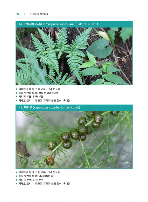 60 ┃ 거제도의 자연환경 ■ 멸종위기 등 중요 종 여부전국 분포종 ■ 종의 일반적 특성상록 여러해살이풀 ■ 지리적 분포전국 분포 ■ 거제도 조사 시 발견된 지역과 분포 양상옥녀봉 47. 산족제비고사리 Dryopteris bissetiana Baker C. Chr. ■ 멸종위기 등 중요 종 여부전국 분포종 ■ 종의 일반적 특성여러해살이풀 ■ 지리적 분포전국 분포 ■ 거제도 조사 시 발견된 지역과 분포 양상옥녀봉 48. 비짜루 Asparagus schoberioides Kunth