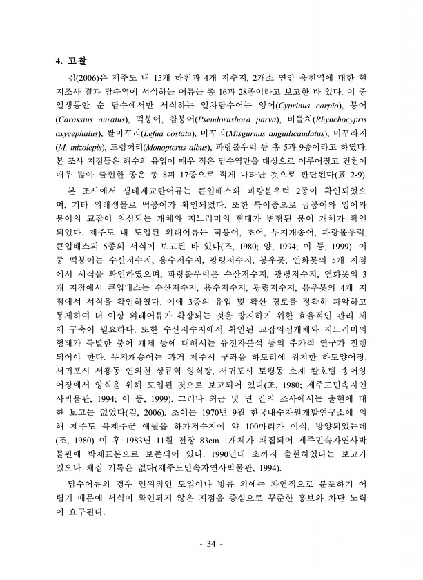 34 4. 고찰 김 2006 은 제주도 내 15개 하천과 4개 저수지, 2개소 연안 용천역에 대한 현 지조사 결과 담수역에 서식하는 어류는 총 16과 28종이라고 보고한 바 있다. 이 중 일생동안 순 담수에서만 서식하는 일차담수어는 잉어 Cyprinus carpio , 붕어 Carassius auratus , 떡붕어, 참붕어 Pseudorasbora parva , 버들치 Rhynchocypris oxycephalus , 쌀미꾸리 Lefua costata , 미꾸리 Misgurnus anguilicaudatus , 미꾸라지 M. mizolepis , 드렁허리 Monopterus albus , 파랑볼우럭 등 총 5과 9종이라고 하였다. 본 조사 지점들은 해수의 유입이 매우 적은 담수역만을 대상으로 이루어졌고 건...