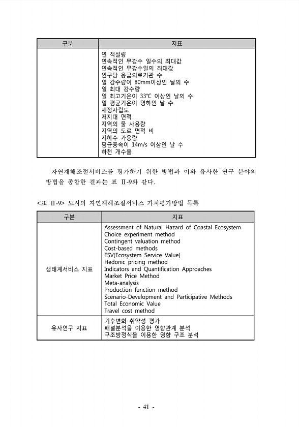 구분 지표 연 적설량 연속적인 무강수 일수의 최대값 연속적인 무강수일의 최대값 인구당 응급의료기관 수 일 강수량이 80mm이상인 날의 수 일 최대 강수량 일 최고기온이 33℃ 이상인 날의 수 일 평균기온이 영하인 날 수 재정자립도 저지대 면적 지역의 물 사용량 지역의 도로 면적 비 지하수 가용량 평균풍속이 14m/s 이상인 날 수 하천 개수율 구분 지표 생태계서비스 지표 Assessment of Natural Hazard of Coastal Ecosystem Choice experiment method Contingent valuation method Cost-based methods ESV Ecosystem Service Value Hedonic pricing method Indicators and Qua...