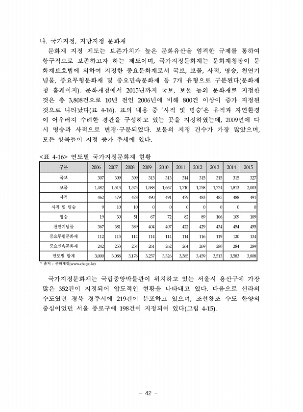 42 나 국가지정 지방지정 문화재 문화재 지정 제도는 보존가치가 높은 문화유산을 엄격한 규제를 통하여 항구적으로 보존하고자 하는 제도이며 국가지정문화재는 문화재청장이 문 화재보호법에 의하여 지정한 중요문화재로서 국보 보물 사적 명승 천연기 념물 중요무형문화재 및 중요민속문화재 등 개 유형으로 구분된다 문화재 청 홈페이지 문화재청에서 년까지 국보 보물 등의 문화재로 지정한 것은 총 건으로 년 전인 년에 비해 건 이상이 증가 지정된 것으로 나타났다 표 표의 내용 중 사적 및 명승 은 유적과 자연환경 이 어우러져 수려한 경관을 구성하고 있는 곳을 지정하였는데 년에 다 시 명승과 사적으로 변경 구분되었다 보물의 지정 건수가 가장 많았으며 모든 항목들이 지정 증가 추세에 있다 구분 국보 보물 사적 사적 및 명승 명승...