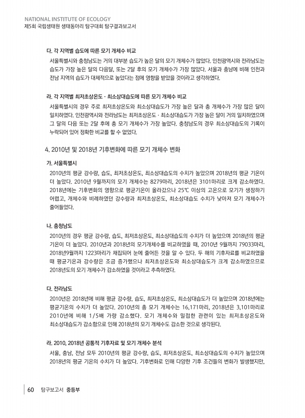 60 탐구보고서 중등부 제5회 국립생태원 생태동아리 탐구대회 탐구결과보고서 다. 각 지역별 습도에 따른 모기 개체수 비교 서울특별시와 충청남도는 거의 대부분 습도가 높은 달의 모기 개체수가 많았다. 인천광역시와 전라남도는 습도가 가장 높은 달의 다음달, 또는 2달 후의 모기 개체수가 가장 많았다. 서울과 충남에 비해 인천과 전남 지역의 습도가 대체적으로 높았다는 점에 영향을 받았을 것이라고 생각하였다. 라. 각 지역별 최저초상온도·최소상대습도에 따른 모기 개체수 비교 서울특별시의 경우 주로 최저초상온도와 최소상대습도가 가장 높은 달과 총 개체수가 가장 많은 달이 일치하였다. 인천광역시와 전라남도는 최저초상온도·최소상대습도가 가장 높은 달이 거의 일치하였으며 그 달의 다음 또는 2달 후에 총 모기 개체수가 가...
