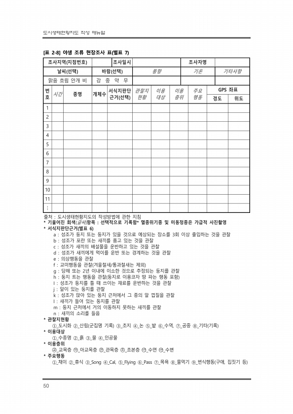 도시생태현황지도 작성 매뉴얼 50 조사지역 지점번호 조사일시 조사자명 날씨 선택 바람 선택 풍향 기온 기타사항 맑음 흐림 안개 비 강 중 약 무 번호 시간 종명 개체수 서식지판단 근거 선택 관찰지 현황 이용 대상 이용 층위 주요 행동 GPS 좌표 경도 위도 1 2 3 4 5 6 7 8 9 10 11 ? 출처 도시생태현황지도의 작성방법에 관한 지침 * 기울어진 회색 글씨 항목 선택적으로 기록함* 멸종위기종 및 미동정종은 가급적 사진촬영 * 서식지판단근거 별표 6 a 성조가 둥지 또는 둥지가 있을 것으로 예상되는 장소를 3회 이상 출입하는 것을 관찰 b 성조가 포란 또는 새끼를 품고 있는 것을 관찰 c 성조가 새끼의 배설물을 운반하고 있는 것을 관찰 d 성조가 새끼에게 먹이를 운반 또는 경계하는 것을 관찰 e ...