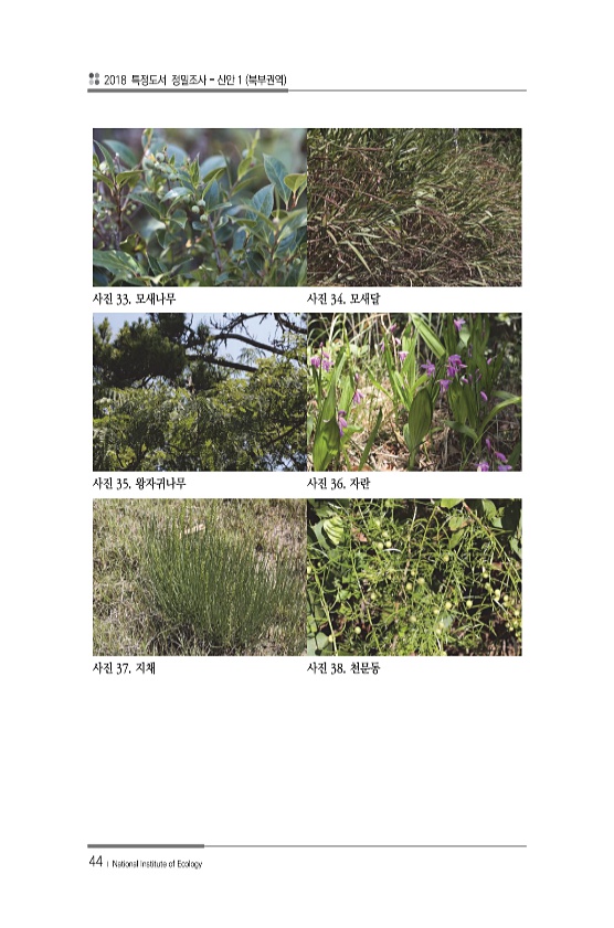 2018 특정도서 정밀조사 신안 1 북부권역 44 ? National Institute of Ecology 사진 33. 모새나무 사진 34. 모새달 사진 35. 왕자귀나무 사진 36. 자란 사진 37. 지채 사진 38.천문동