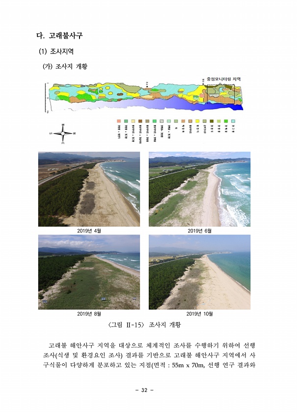 32 다. 고래불사구 1 조사지역 가 조사지 개황 2019년 4월 2019년 6월 2019년 8월 2019년 10월 그림 Ⅱ-15 조사지 개황 고래불 해안사구 지역을 대상으로 체계적인 조사를 수행하기 위하여 선행 조사 식생 및 환경요인 조사 결과를 기반으로 고래불 해안사구 지역에서 사 구식물이 다양하게 분포하고 있는 지점 면적 55m x 70m, 선행 연구결과와