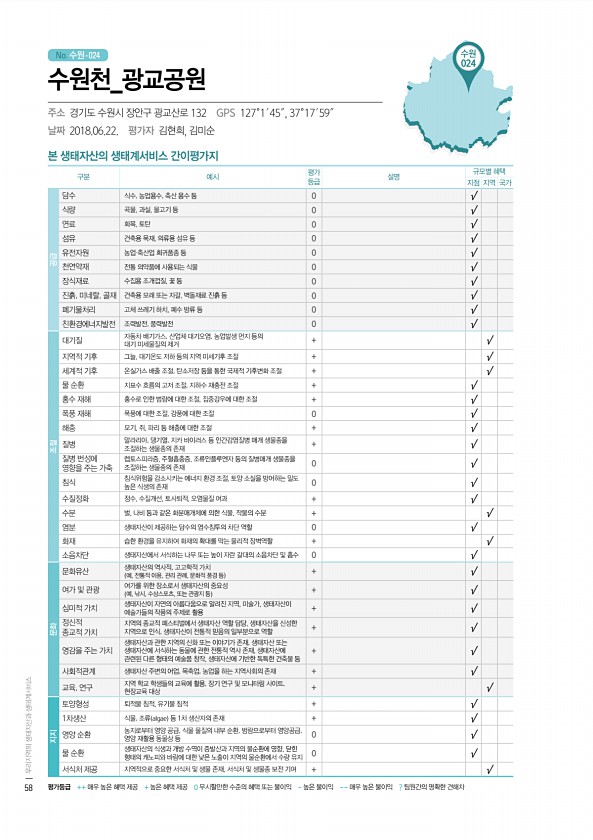No. 수원- 수원 024 본 생태자산의 생태계서비스 간이평가지 구분 예시 평가 등급 설명 규모별 혜택 지점 지역 국가 공급 담수 식수, 농업용수, 축산 용수 등 0 √ 식량 곡물, 과실, 물고기 등 0 √ 연료 화목, 토탄 0 √ 섬유 건축용 목재, 의류용 섬유 등 0 √ 유전자원 농업·축산업 희귀품종 등 0 √ 천연약재 전통 의약품에 사용되는 식물 0 √ 장식재료 수집용 조개껍질, 꽃 등 0 √ 진흙, 미네랄, 골재 건축용 모래 또는 자갈, 벽돌재료 진흙 등 0 √ 폐기물처리 고체 쓰레기 하치, 폐수 방류 등 0 √ 친환경에너지발전 조력발전, 풍력발전 0 √ 조절 대기질 자동차 배기가스, 산업체 대기오염, 농업발생 먼지 등의 대기 미세물질의 제거 + √ 지역적 기후 그늘, 대기온도 저하 등의 지역 미세기...