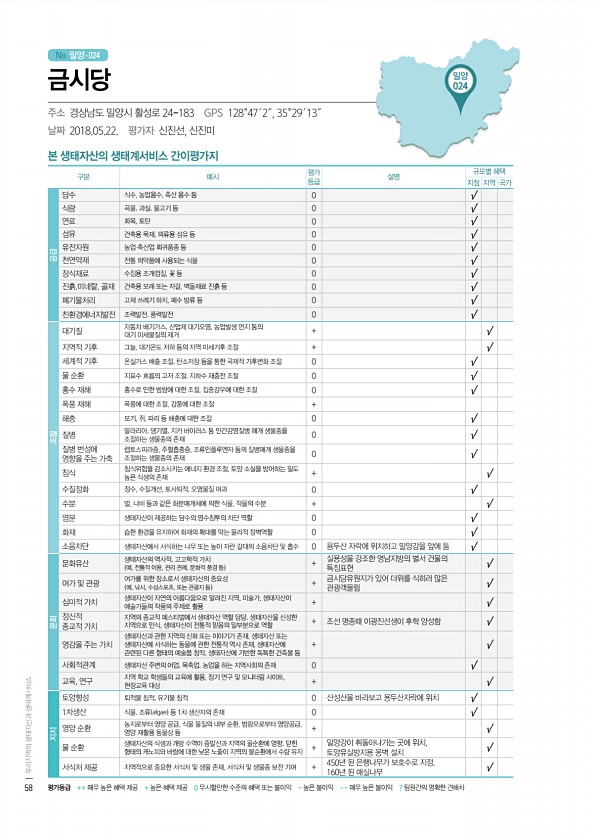 No. 밀양- 본 생태자산의 생태계서비스 간이평가지 구분 예시 평가 등급 설명 규모별 혜택 지점 지역 국가 공급 담수 식수, 농업용수, 축산 용수 등 0 √ 식량 곡물, 과실, 물고기 등 0 √ 연료 화목, 토탄 0 √ 섬유 건축용 목재, 의류용 섬유 등 0 √ 유전자원 농업·축산업 희귀품종 등 0 √ 천연약재 전통 의약품에 사용되는 식물 0 √ 장식재료 수집용 조개껍질, 꽃 등 0 √ 진흙,미네랄, 골재 건축용 모래 또는 자갈, 벽돌재료 진흙 등 0 √ 폐기물처리 고체 쓰레기 하치, 폐수 방류 등 0 √ 친환경에너지발전 조력발전, 풍력발전 0 √ 조절 대기질 자동차 배기가스, 산업체 대기오염, 농업발생 먼지 등의 대기 미세물질의 제거 + √ 지역적 기후 그늘, 대기온도 저하 등의 지역 미세기후 조절 + √...