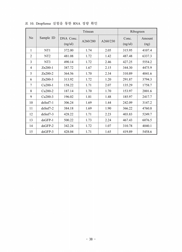 38 10. DropSense RNA No Sample ID Trinean Ribogreen DNA Conc. ng/ul A260/280 A260/230 Conc. ng/ul Amount ng 1 NT1 372.00 1.74 2.05 315.95 4107.4 2 NT2 481.08 1.72 1.42 487.48 6337.3 3 NT3 490.14 1.72 2.46 427.25 5554.2 4 Zn200-1 387.72 1.67 2.15 344.30 4475.9 5 Zn200-2 364.56 1.70 2.34 310.89 4041.6 6 Zn200-3 313.92 1.72 1.20 291.87 3794.3 7 Cu200-1 158.22 1.71 2.07 135.29 1758.7 8 Cu200-2 187.14 ...