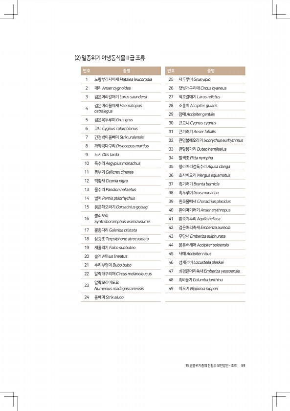 15 멸종위기종의 현황과 보전방안 조류 59 2 멸종위기 야생동식물 II 급 조류 번호 종명 1 노랑부리저어새Platalea leucorodia 2 개리Anser cygnoides 3 검은머리갈매기Larus saundersi 4 검은머리물떼새Haematopus ostralegus 5 검은목두루미Grus grus 6 고니Cygnus columbianus 7 긴점박이올빼미Strix uralensis 8 까막딱다구리Dryocopus martius 9 느시Otis tarda 10 독수리Aegypius monachus 11 뜸부기Gallicrex cinerea 12 먹황새Ciconia nigra 13 물수리Pandion haliaetus 14 벌매Pernis ptilorhychus 15 붉은해오라기Gorsachius...