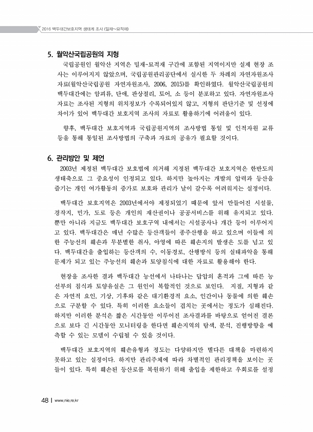 2016 백두대간보호지역 생태계 조사 밀재묘적재 48Ⅰwww.nie.re.kr 5. 월악산국립공원의 지형 국립공원인 월악산 지역은 밀재묘적재 구간에 포함된 지역이지만 실제 현장 조 사는 이루어지지 않았으며, 국립공원관리공단에서 실시한 두 차례의 자연자원조사 자료 월악산국립공원 자연자원조사, 2006, 2015 를 확인하였다. 월악산국립공원의 백두대간에는 암괴류, 단애, 판상절리, 토어, 소 등이 분포하고 있다. 자연자원조사 자료는 조사된 지형의 위치정보가 수록되어있지 않고, 지형의 판단기준 및 선정에 차이가 있어 백두대간 보호지역 조사의 자료로 활용하기에 어려움이 있다. 향후, 백두대간 보호지역과 국립공원지역의 조사방법 통일 및 인적자원 교류 등을 통해 통일된 조사방법의 구축과 자료의 공유가 필요할 것이다....