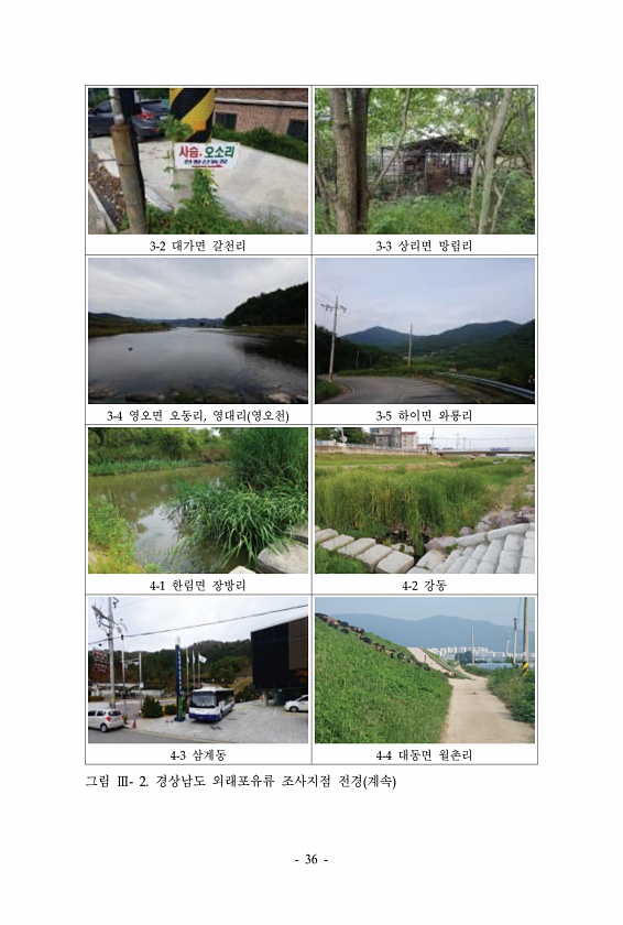 3-2 대가면 갈천리 3-3 상리면 망림리 3-4 영오면 오동리, 영대리 영오천 3-5 하이면 와룡리 4-1 한림면 장방리 4-2 강동 4-3 삼계동 4-4 대동면 월촌리 그림 Ⅲ- 2. 경상남도 외래포유류 조사지점 전경 계속 36